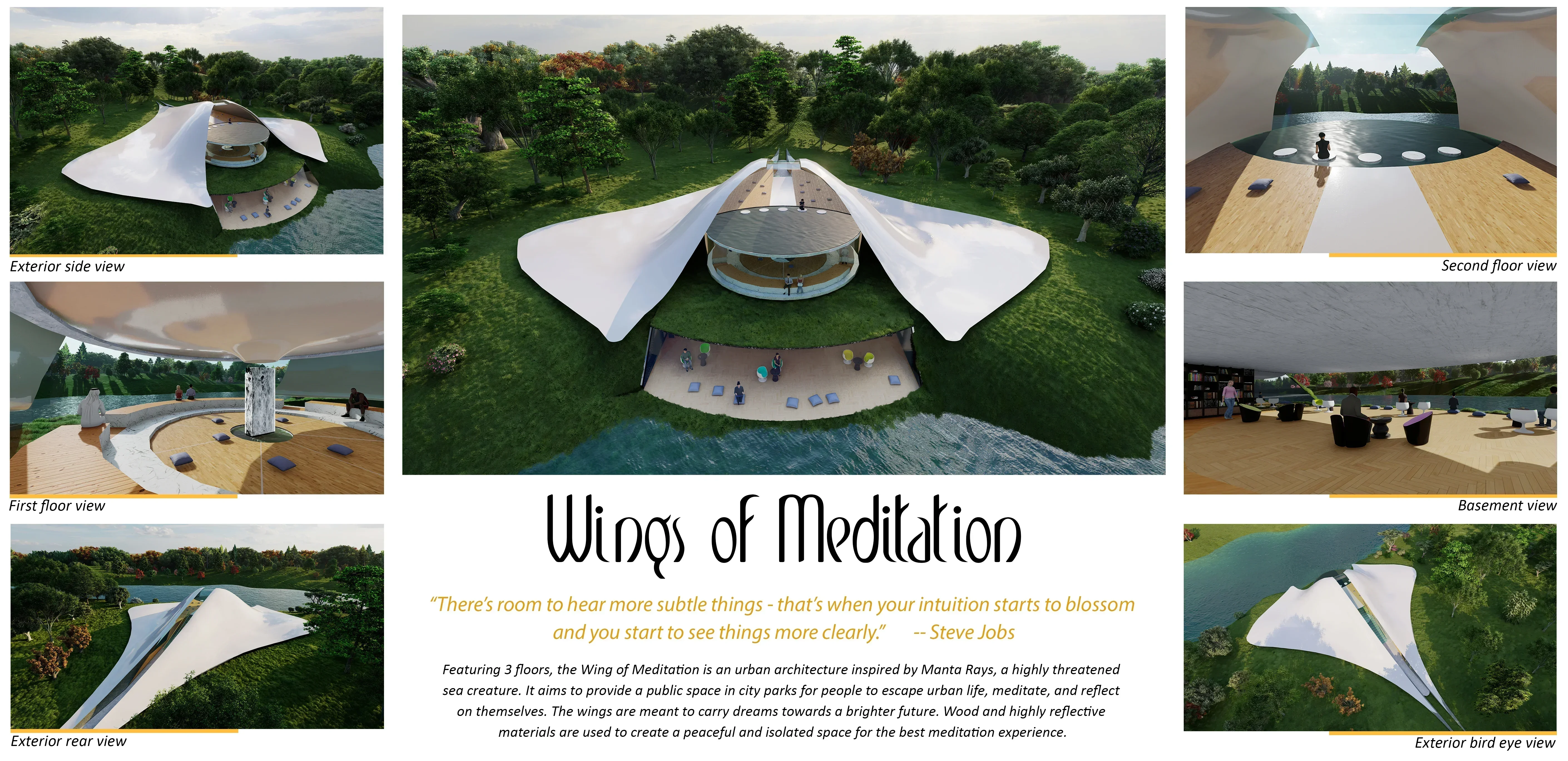 After many design iterations, this ultimate design is modeled after the endangered Manta Rays, which I learned about during my PADI scuba-diving training in middle school (yes, I have a scuba-diving license :) It was a perfect opportunity to model an endangered species, looking up to the sky for a brighter future, where their species is no longer hunted by humans. I hope to deliver the same hope for people in troubling times of their lives, and provide some encourage to those people who are trying hard to stay alive. I believe in a world of common well-being, and this design is an effort to address the public mental-health issue in an increasingly stressful society.
